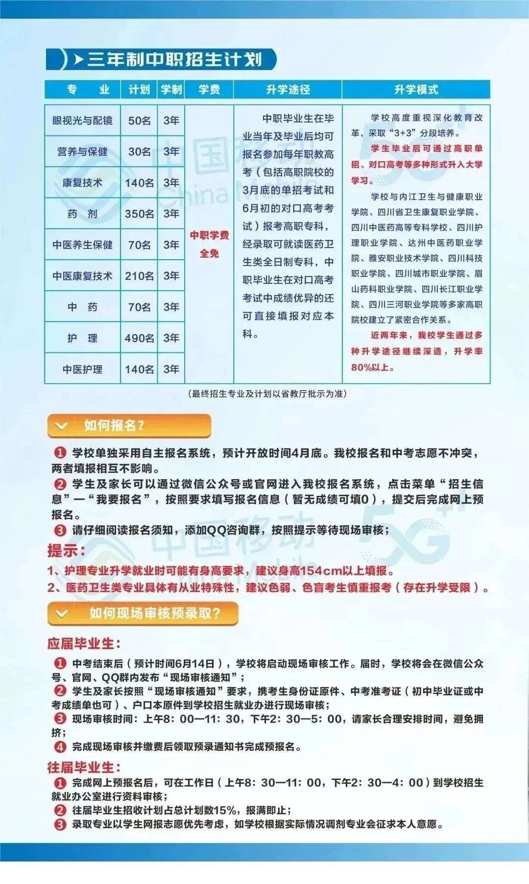 四川省内江医科雷竞技官网竞猜 是一所办学历史悠久、文化底蕴深厚的全日制普通中等职业雷竞技官网竞猜 ,于2003年由内江卫生雷竞技官网竞猜 (成立于1958年)和内江中医学校(成立于1974年)合并组建而成,是市卫生健康委主管的省级重点中等职业雷竞技官网竞猜 。雷竞技官网竞猜 占地面积60.23亩,教学用房面积16000余平方米,教学仪器设备总值2000余万元,现有在职职工279人,教师中本科及以上学历204人(其中,研究生35人),占73%;专任教师210人,其中,中高级专任教师166人,占专任教师的79%,已形成一支专业素养深厚、综合素质优良的教育队伍。雷竞技官网竞猜 图书馆藏书近10万册,期刊杂志180余种,现有全日制学生和成教学生8000余人。