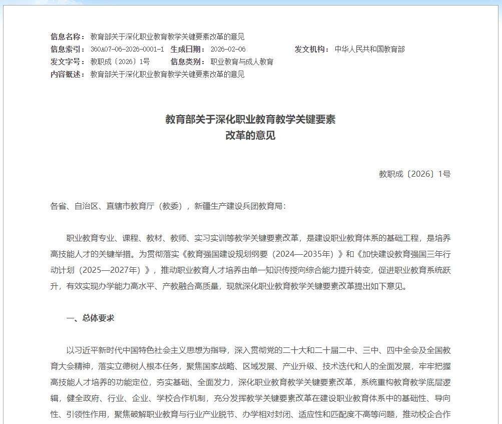 今日,教育部正式发布《关于深化职业教育教学关键要素改革的意见》,明确提出通过动态调整专业设置、优化课程体系、创新教材形态、强化师资建设、深化产教融合等五大举措,系统推进职业教育教学改革,为产业升级和经济高质量发展培养高技能人才。