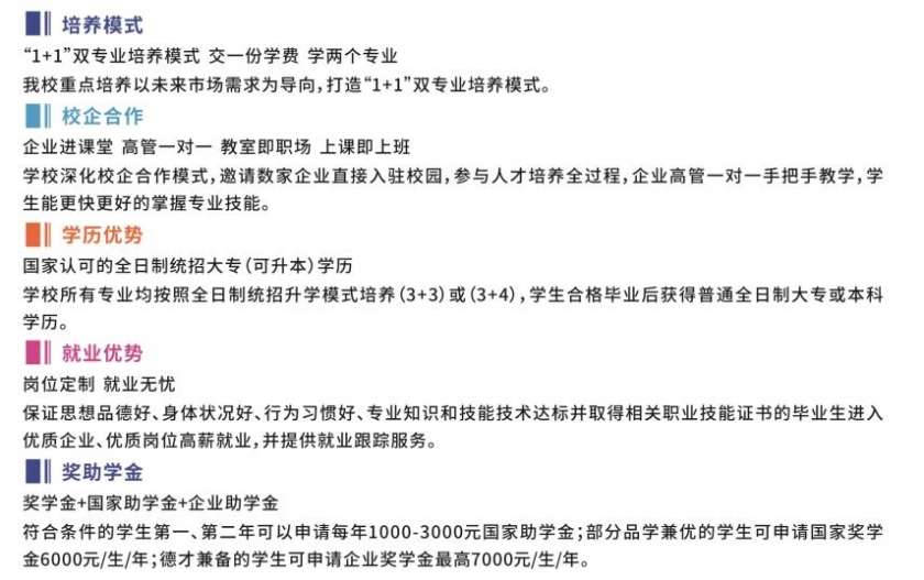 雷竞技官网竞猜 专业有航空服务专业、高铁乘务专业、铁路运输与管理专业、消防技术人才专业,护理专业、轨道车练运用与检修专业,制药技术专业、新能源汽车制造与装配专业、幼儿教育专业、舞蹈表演专业、 美术与设计专业、新媒体策划与运营专业、动漫制作与艺术设计专业、电子商务专业、电商会计专业、国防预备班专业、计算机应用与维修专业、云计算技术及应用专业、大数据技术及应用专业、电子信息工程技术专业、电子竞技运营专业、无人机应用技术专业、汽车维修与美容专业、建筑工程技术专业等等20多个专业,具体的专业可以咨询专业的咨询老师。