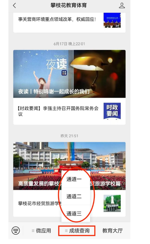 在市教育和体育局微信公众号里点击自定义栏中的“成绩查询”→选择查询通道(通道一、通道二、通道三均可查询成绩,为确保访问的顺畅性,请大家进入不同通道查询分数)。