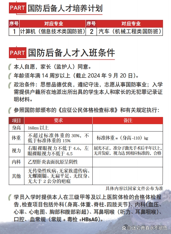 习惯培养:培养学生具备良好的行为习惯和思想素质特种管理:准军事化管理,锻炼学生军人意志和培养军人品质优先接收:完成国防后备人才课程,升入全日制大专或本科,以大学生身份参军,享受优先报名应征、优先体检政审、优先审批定兵、优先安排使用的政策。